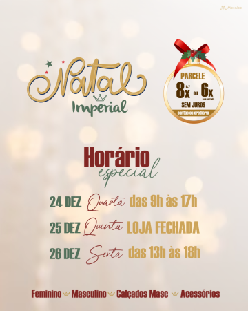 A equipe Imperial Modas deseja um Feliz Natal e um Ano Novo repleto de saúde, alegria e boas vibrações. Lembramos que, após o Réveillon, teremos uma breve pausa na quinta e sexta-feira, retornando normalmente no sábado.